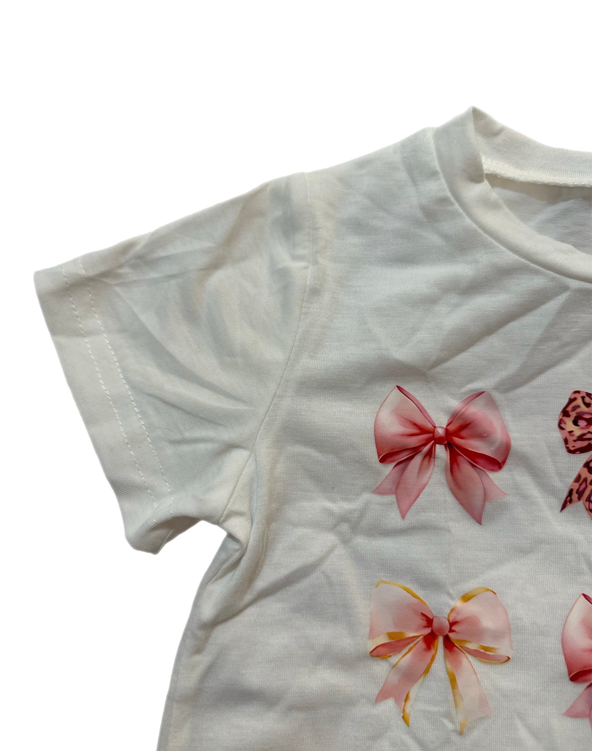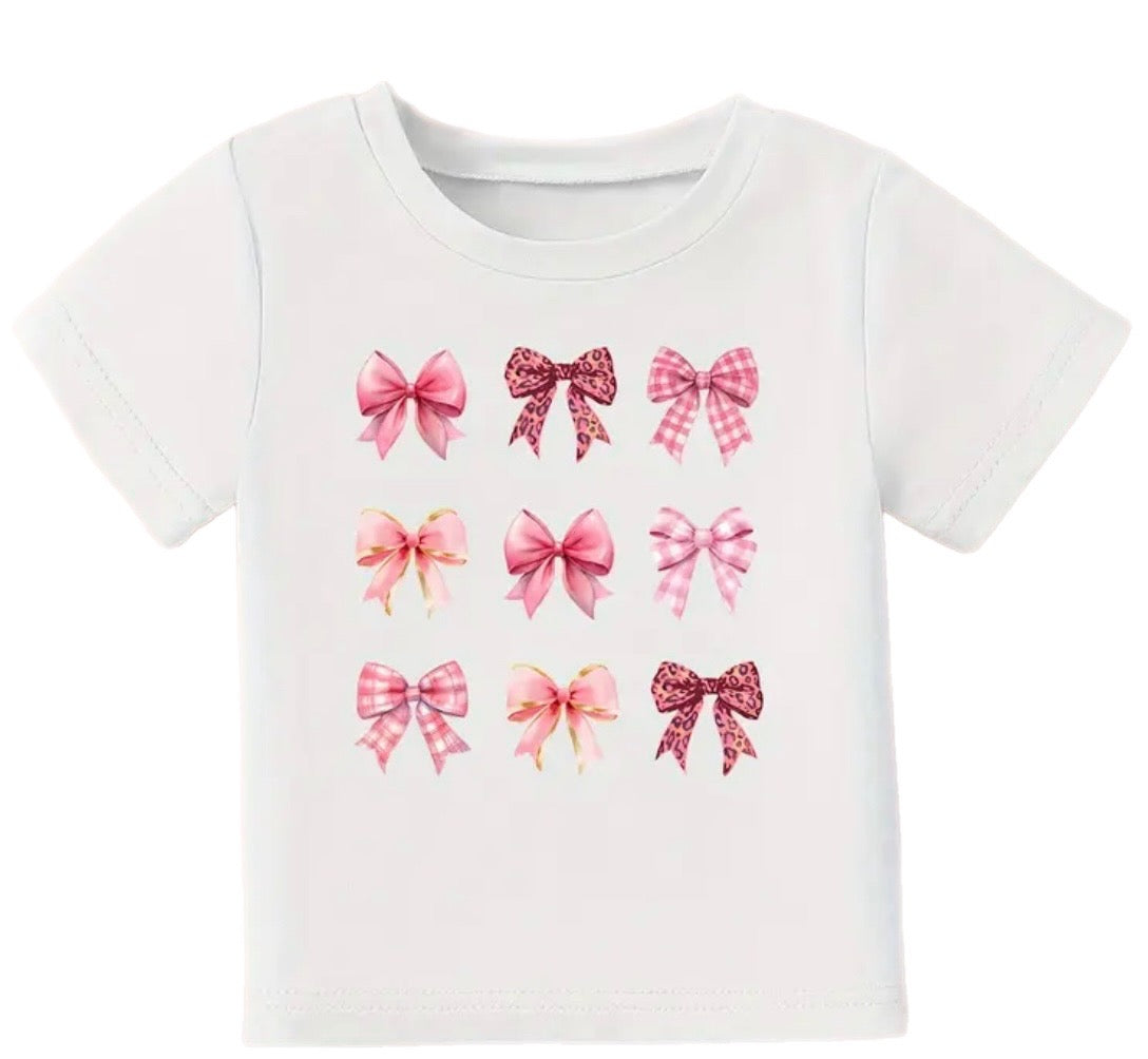 The bountiful bow tee is as gorgeous as it looks in person. It fit perfectly, but also left room for some growth. It can be matched with any pants, that can include leggings, jeans, shorts, etc. The different shades of pink shines beautifully when playing in the sun! We highly recommend for any occasion🩷🎀