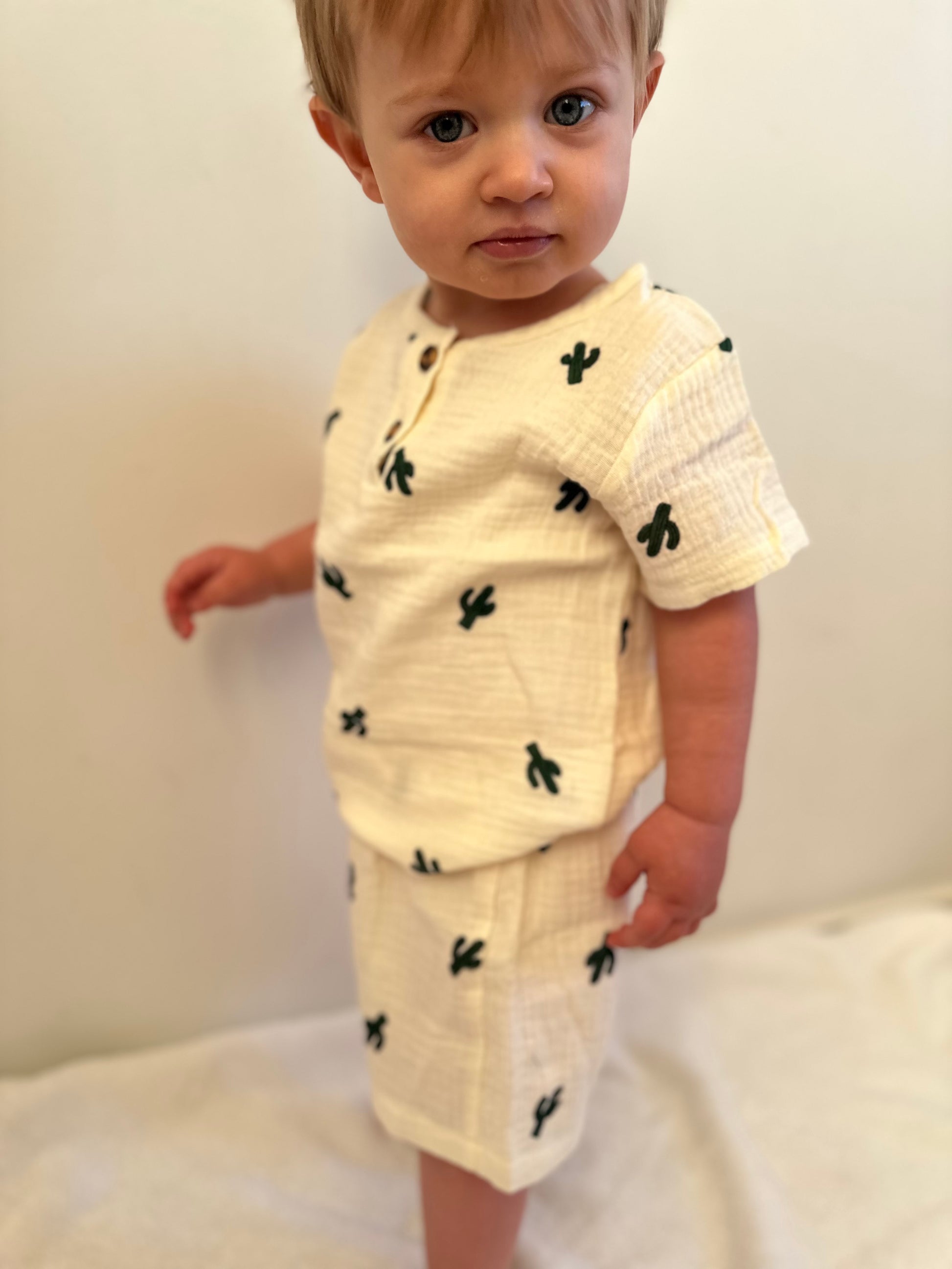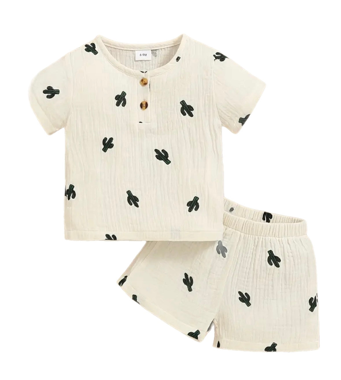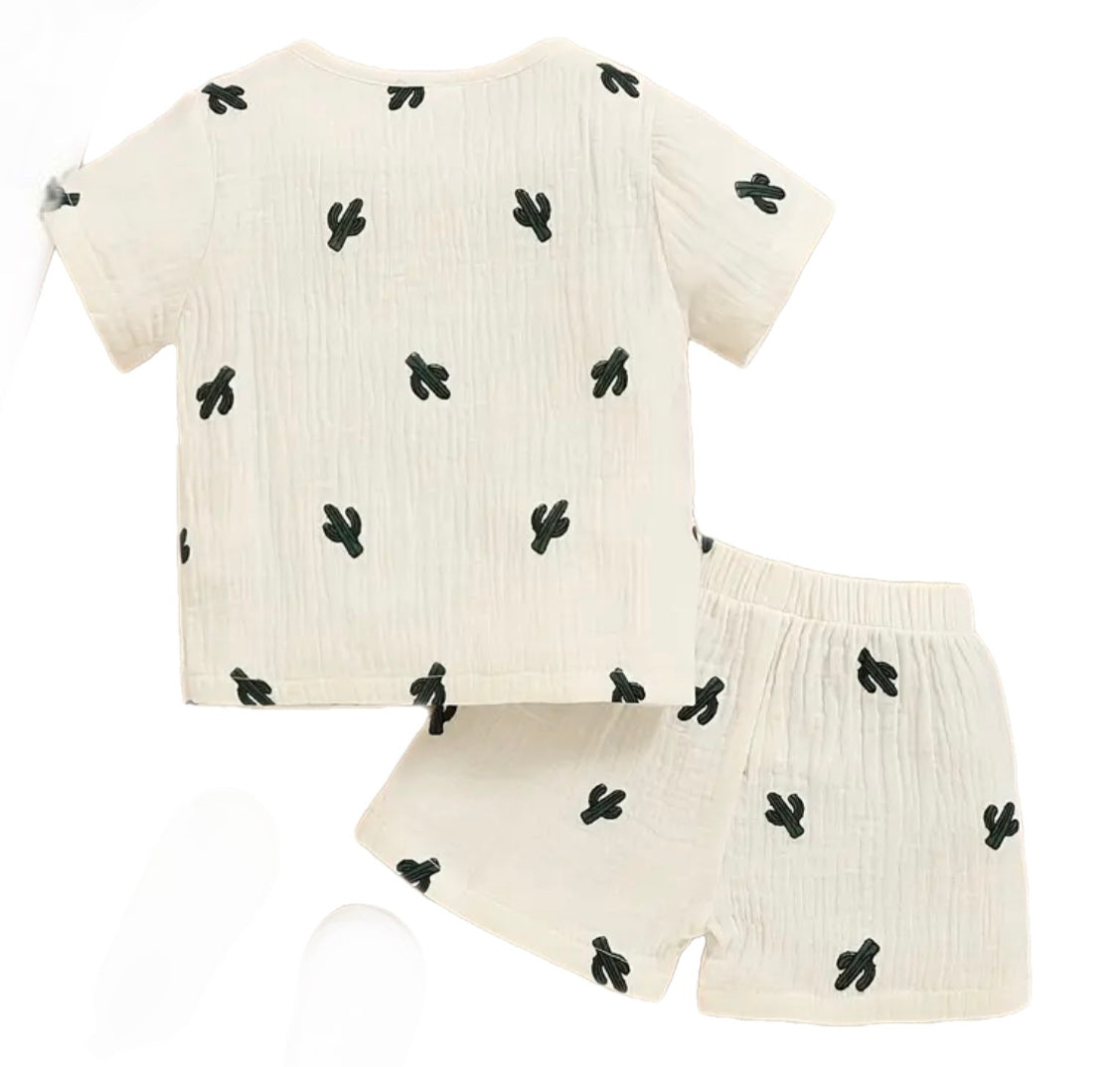This set comes with a beautiful soft top and super cute shorts! Shorts have an easy to wear elastic waistband and the shirt is lightweight. Both feature cute little cacti plants.