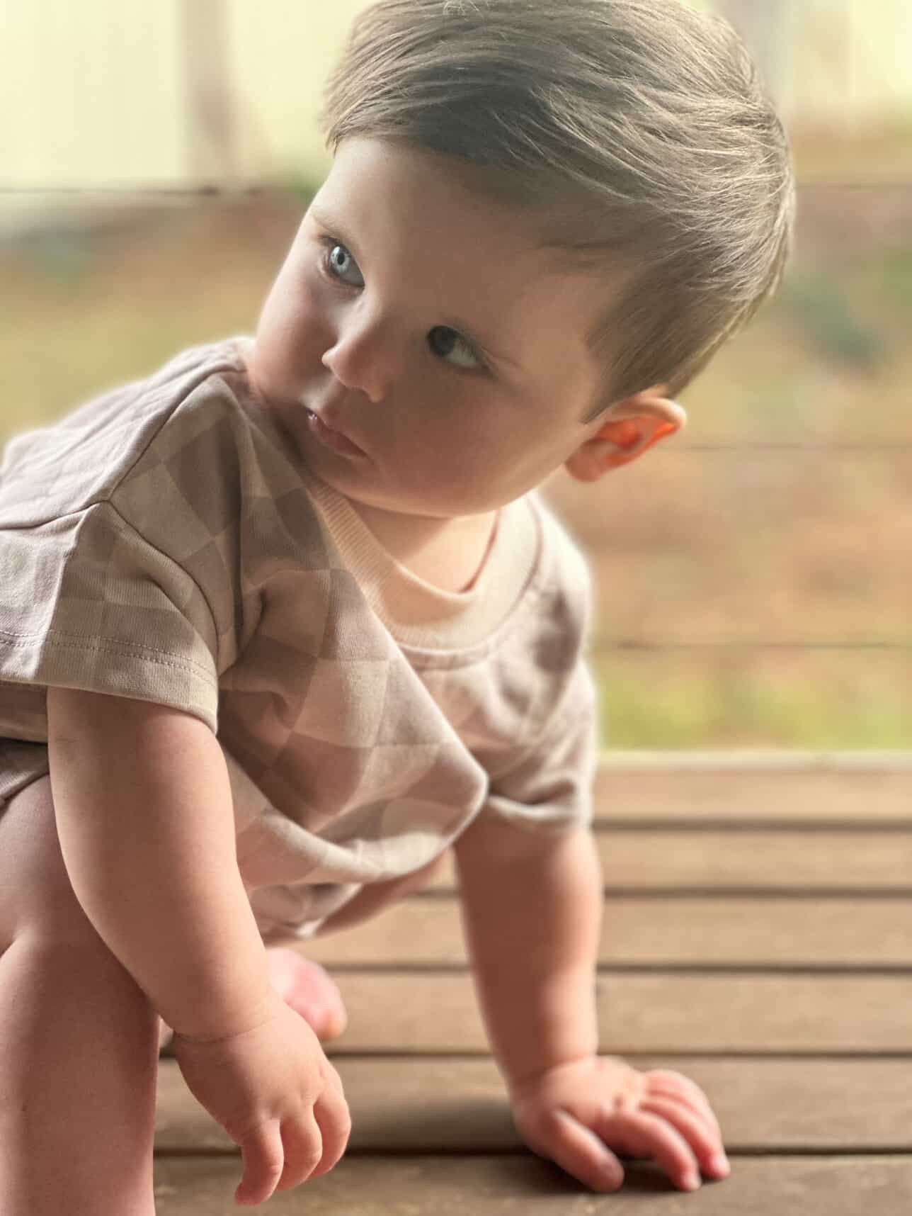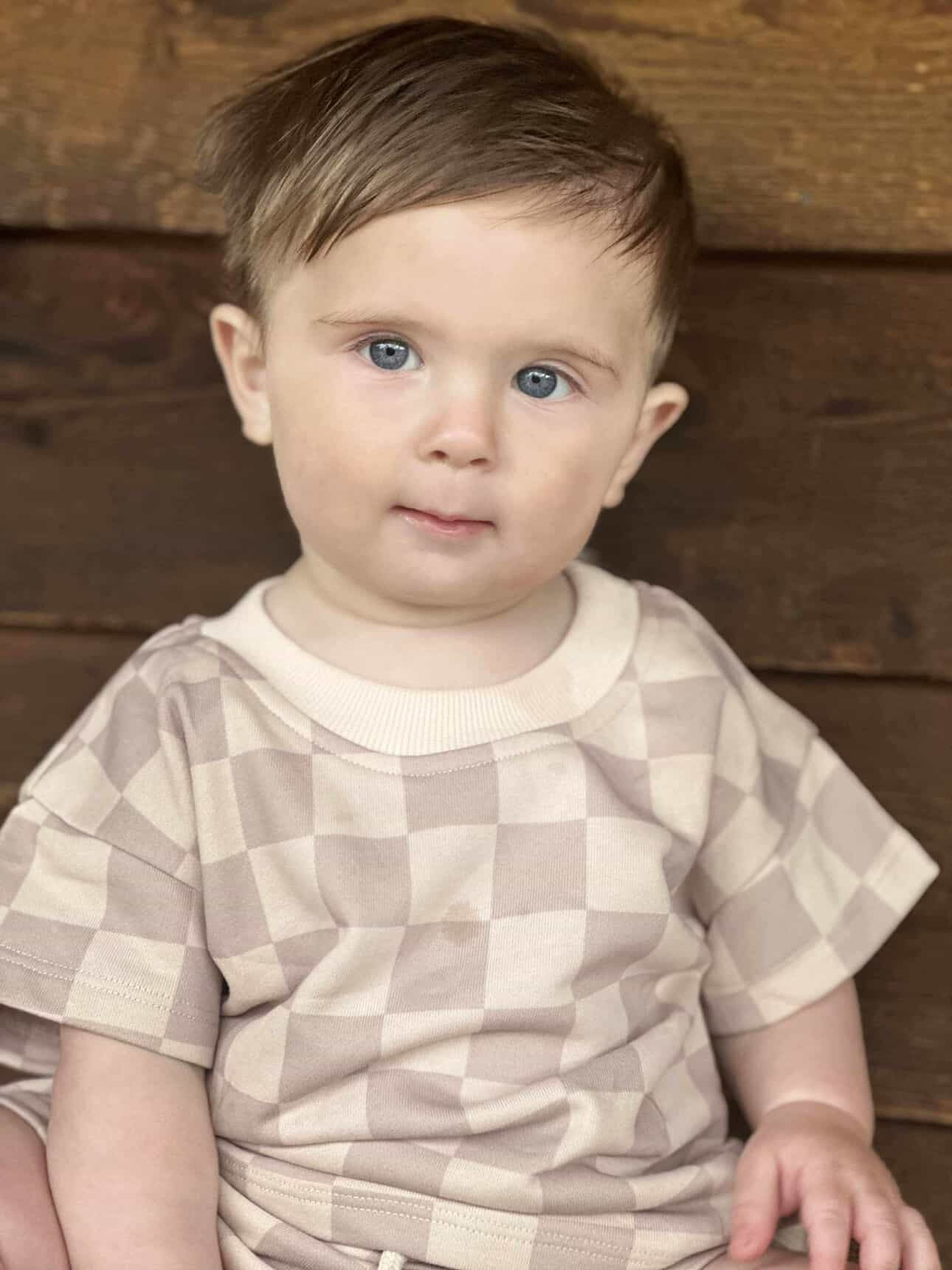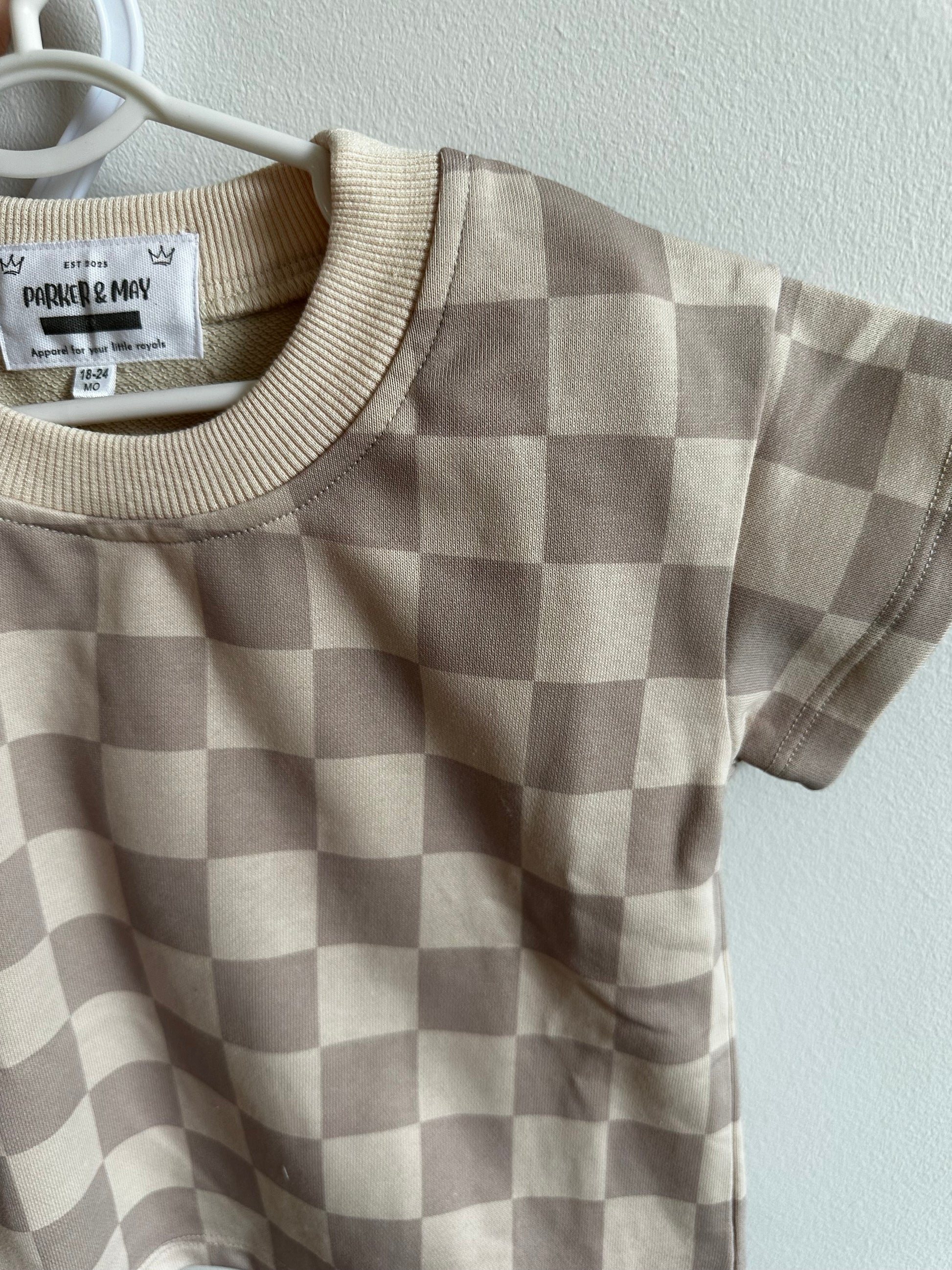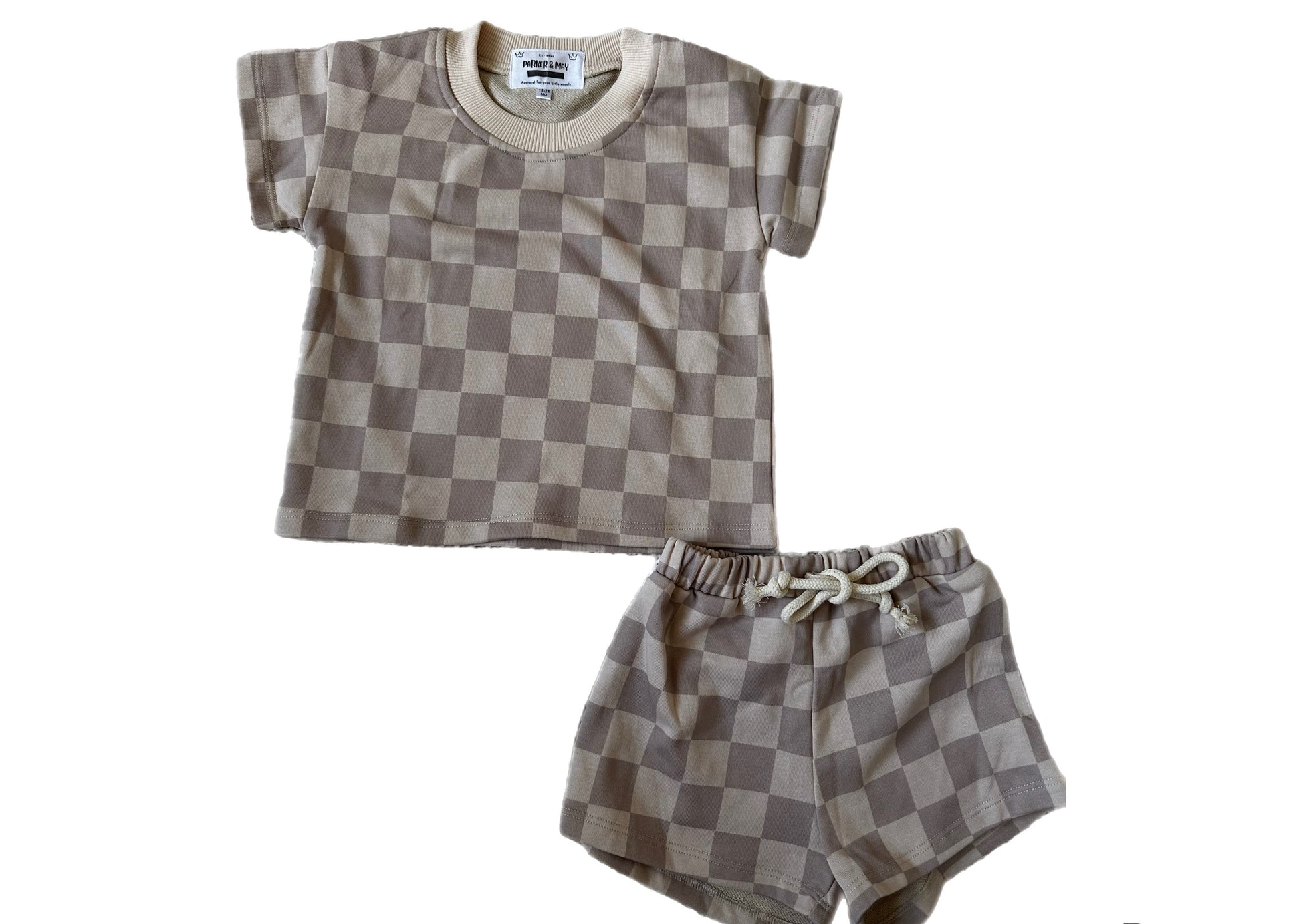 The perfect set for some summer fun! Our Days of Beige Set is easy to wear, wash and run around in. Set includes a rounded neckline shirt and elastic waistband shorts. Shorts fit loosely and feature a non-functional tie. Shirt is short sleeve. Both feature a checkered beige style print.