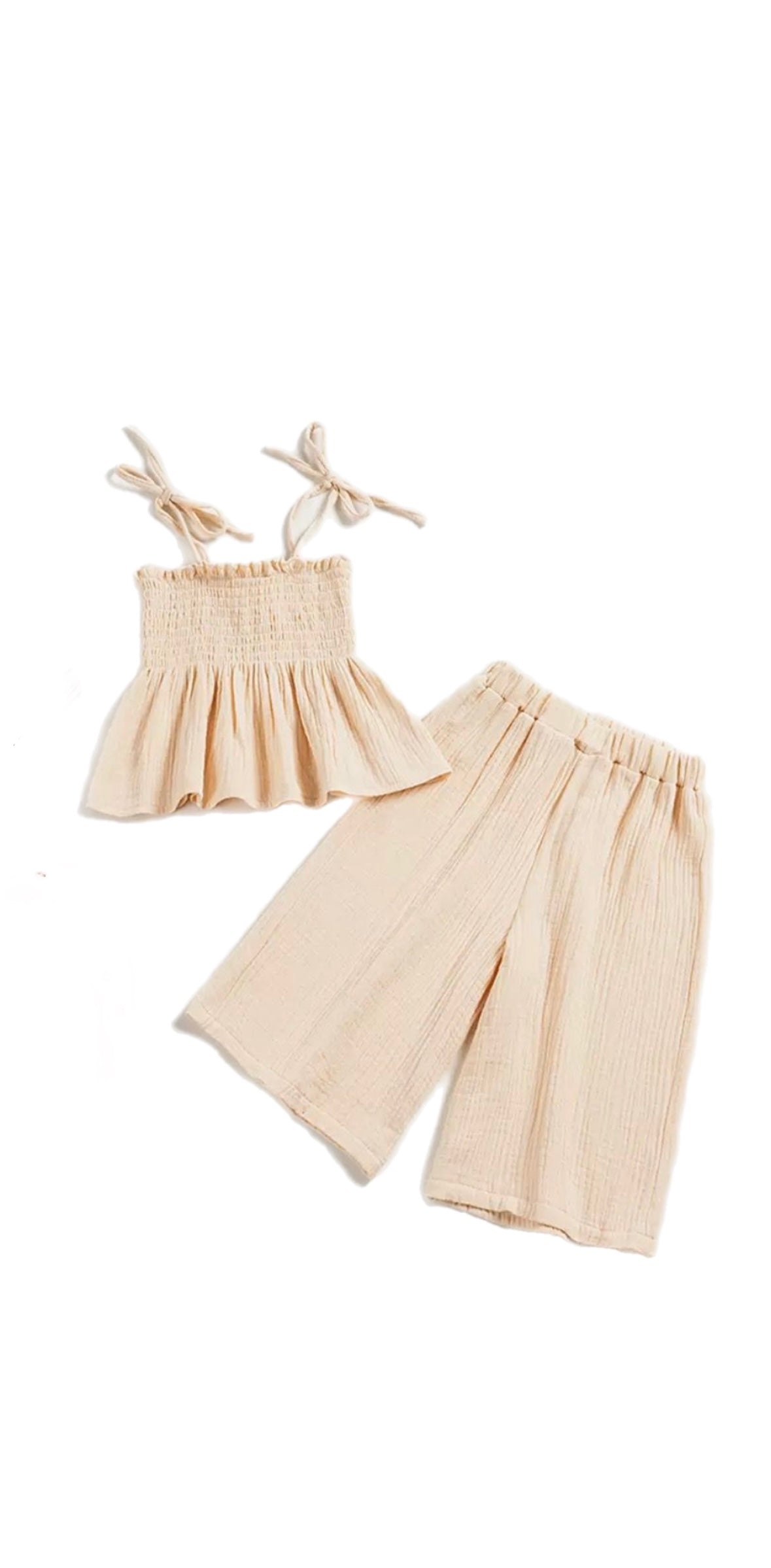 This beautiful set is made from 100% cotton and is lightweight and breathable- perfect for the warmer weather. The top is a mini top, with a ruched upper, bow tie straps and frilled hem. The pants have an elastic waistband and are loose fitting.