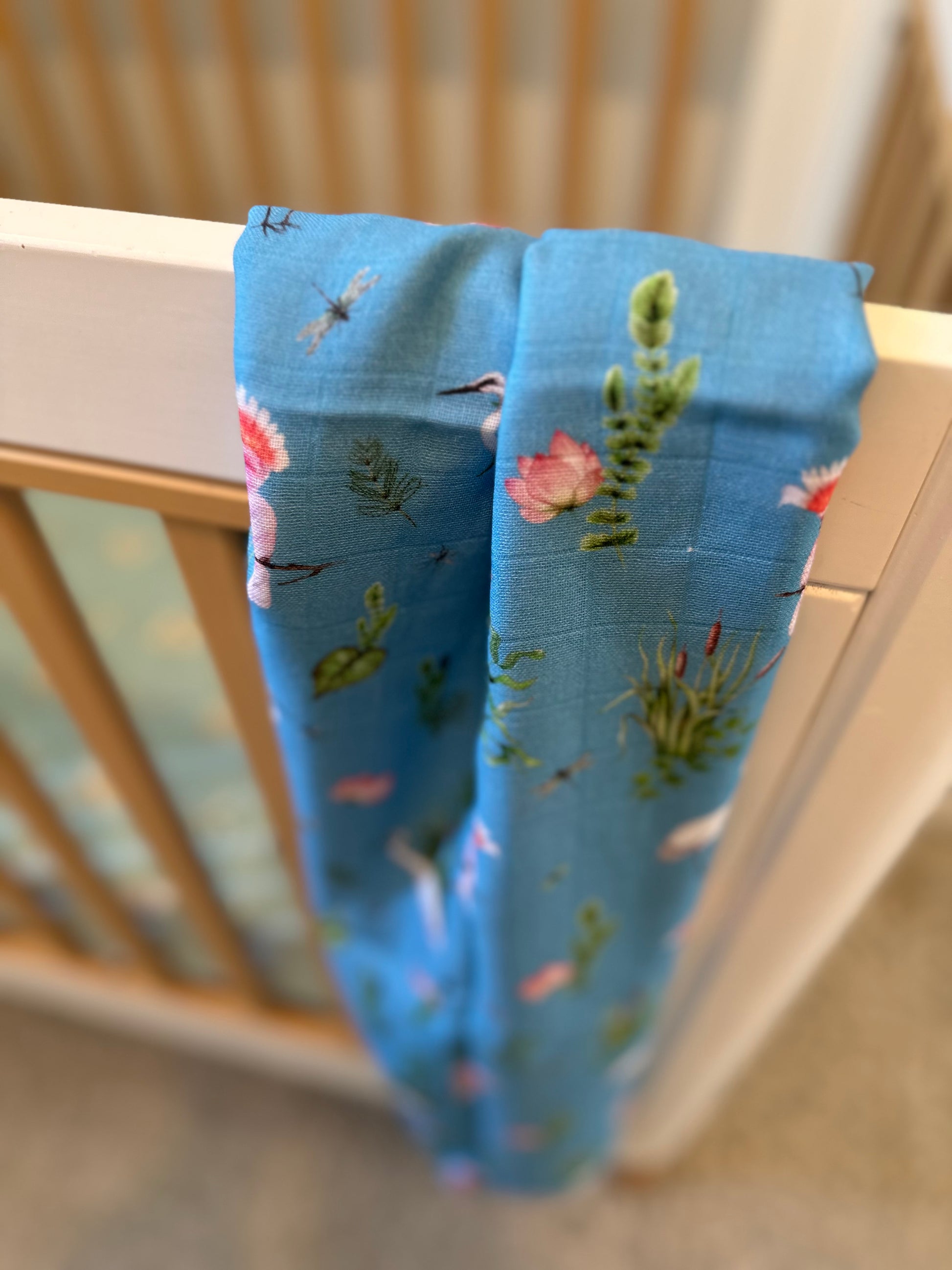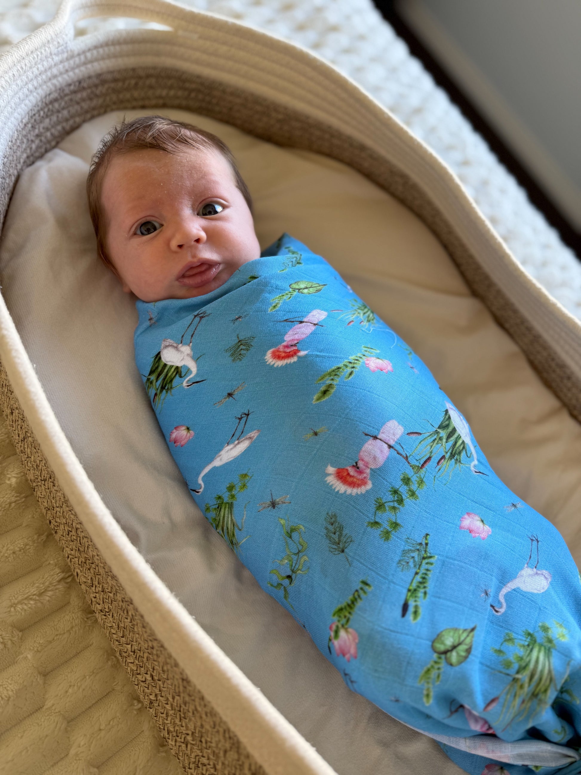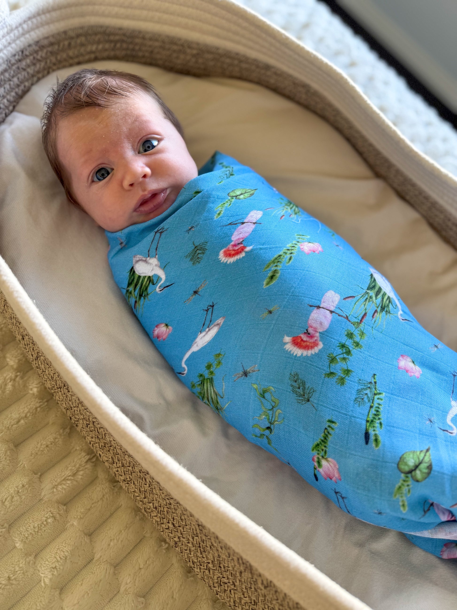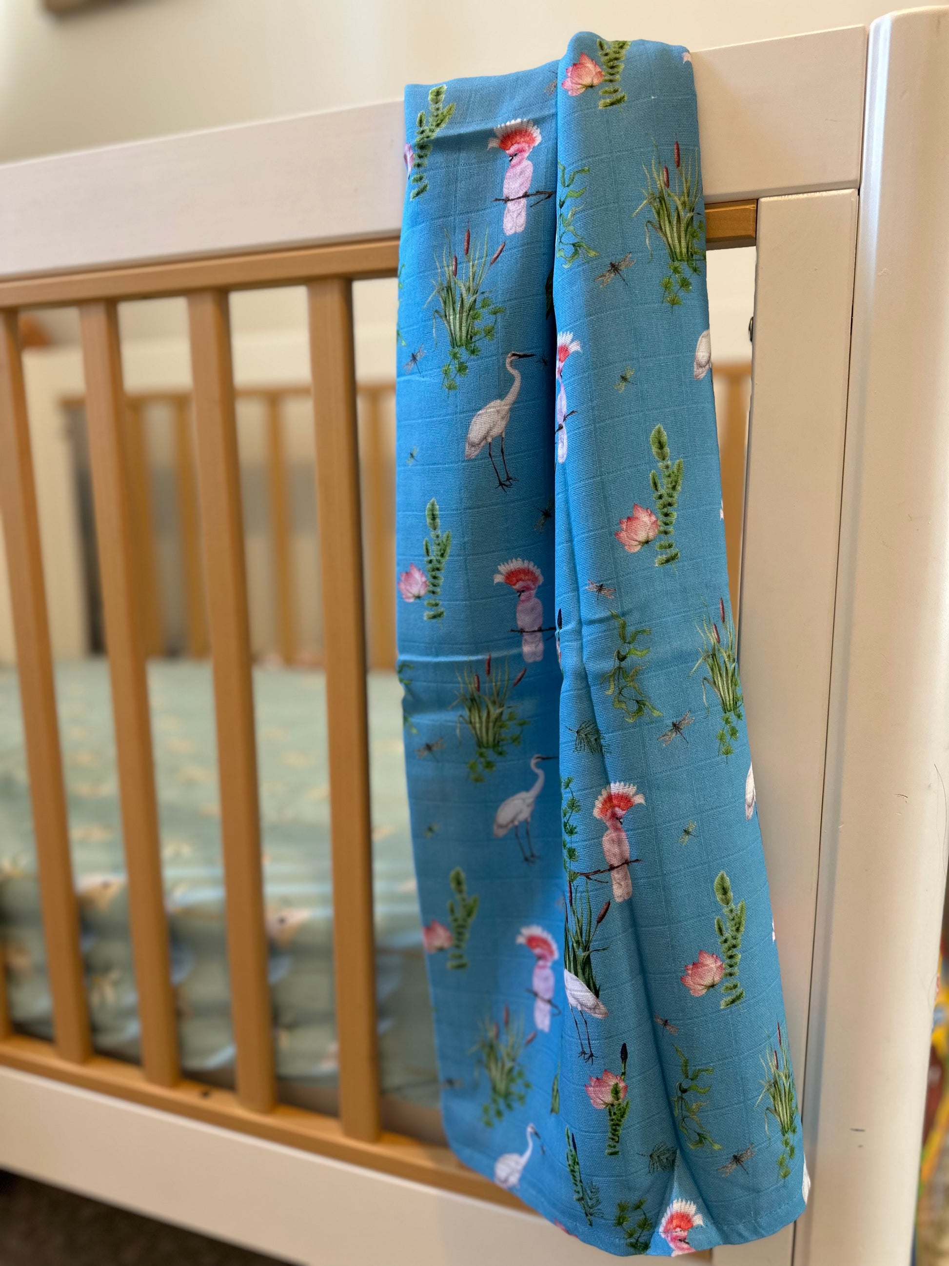 This gorgeous swaddle features Australian freshwater plants, pink major Mitchel’s and great eastern Egrets on a lovely blue background.