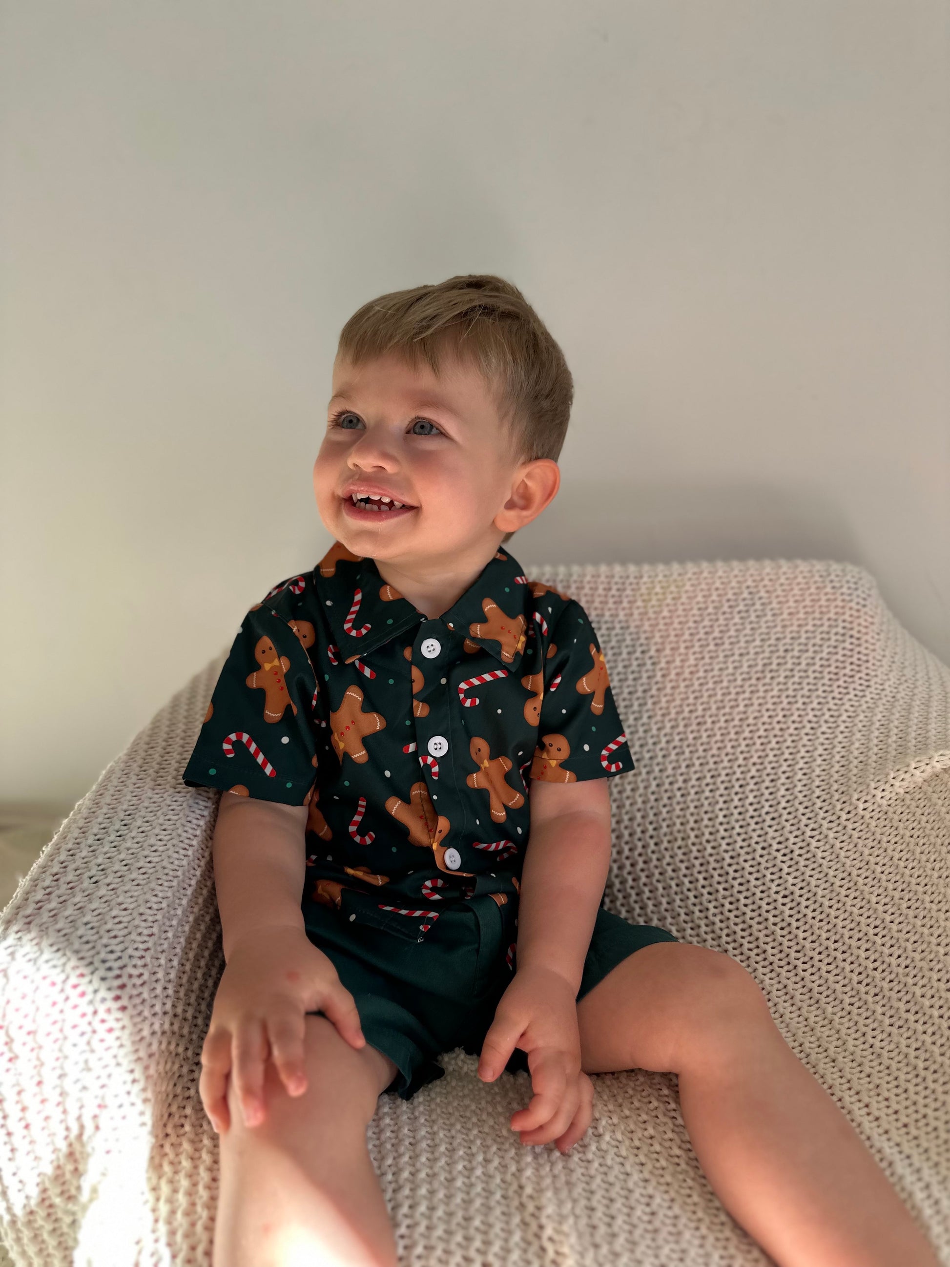 Get ready for Christmas with this super cute Gingerbread Man Set. Set comes with a button up shirt with collar and matching green shorts. Shirt features gingerbread men on a green backdrop. Shorts have an elastic waist band.
