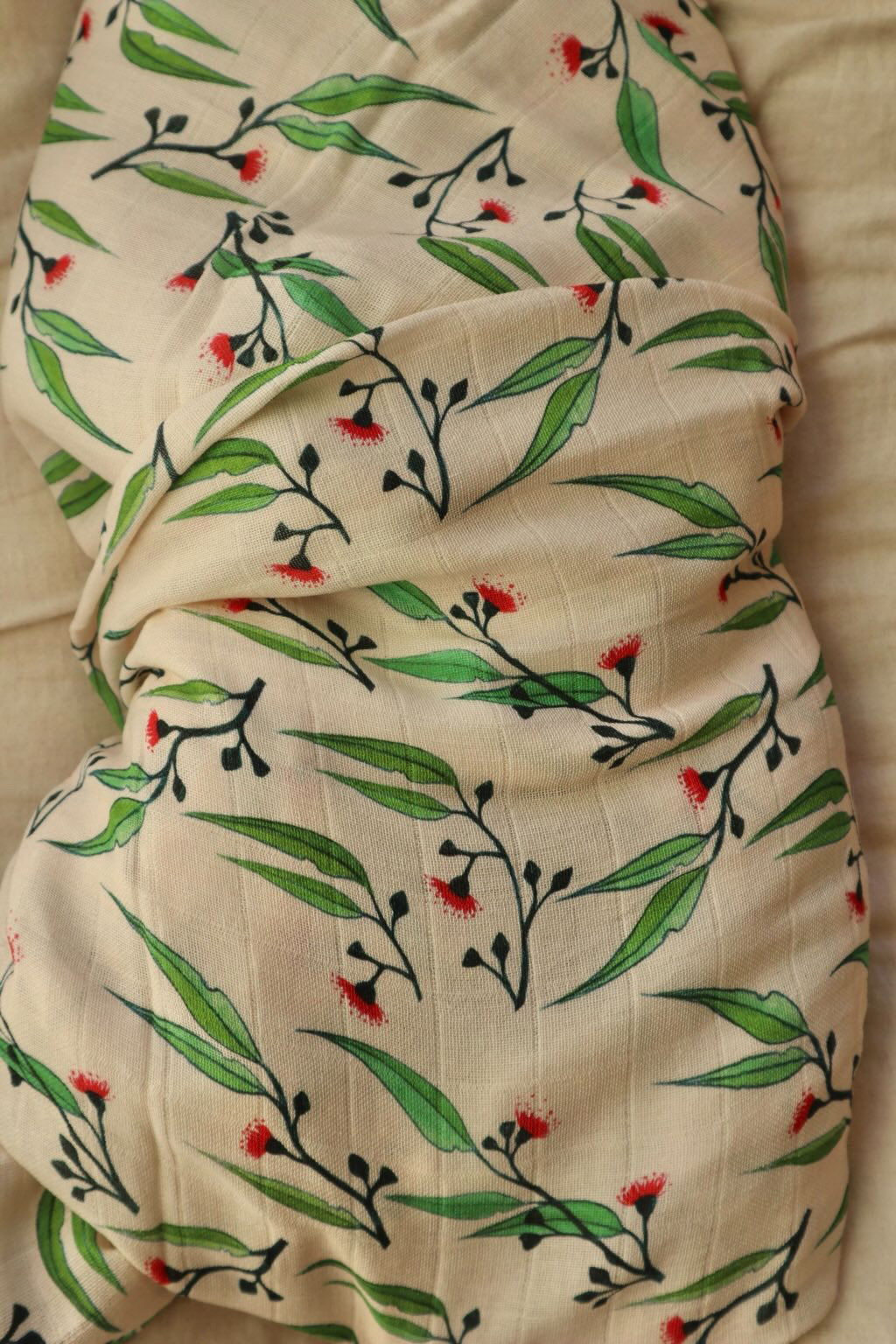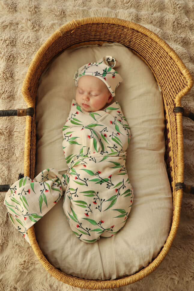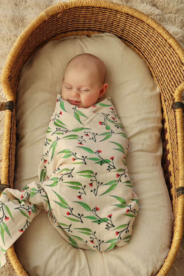 Make a statement with this gorgeous Gum Blossom Organic Muslin Swaddle. Made from muslin cotton this swaddle features fresh pink gum blossoms and green leaves.