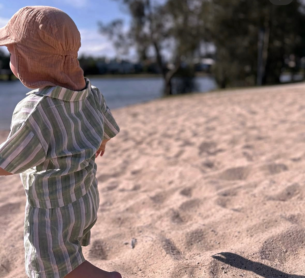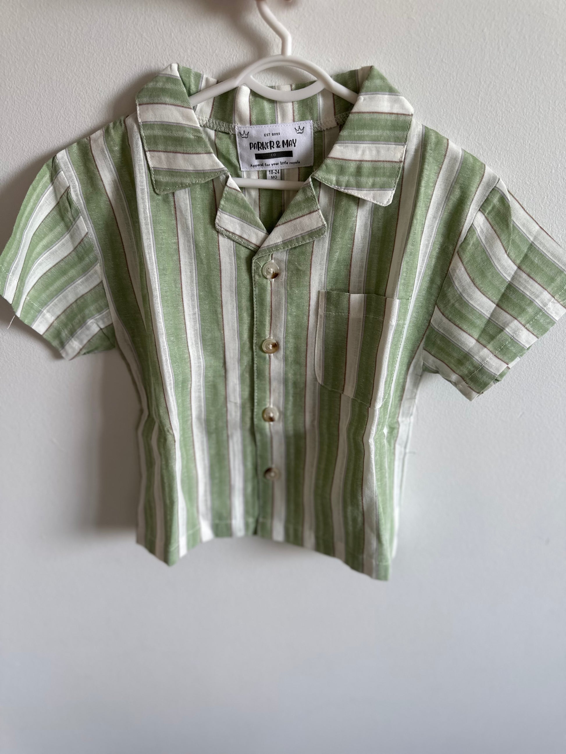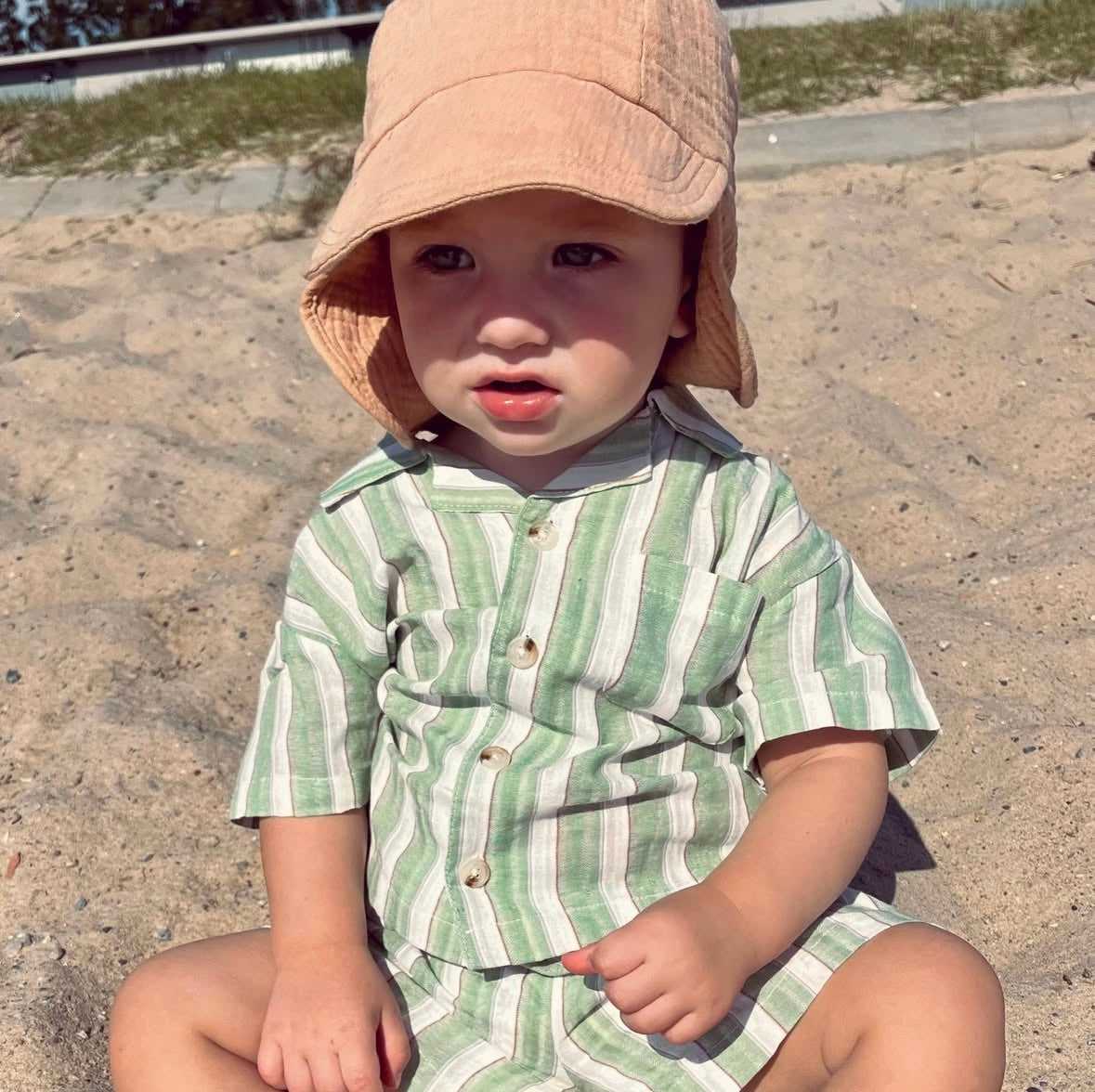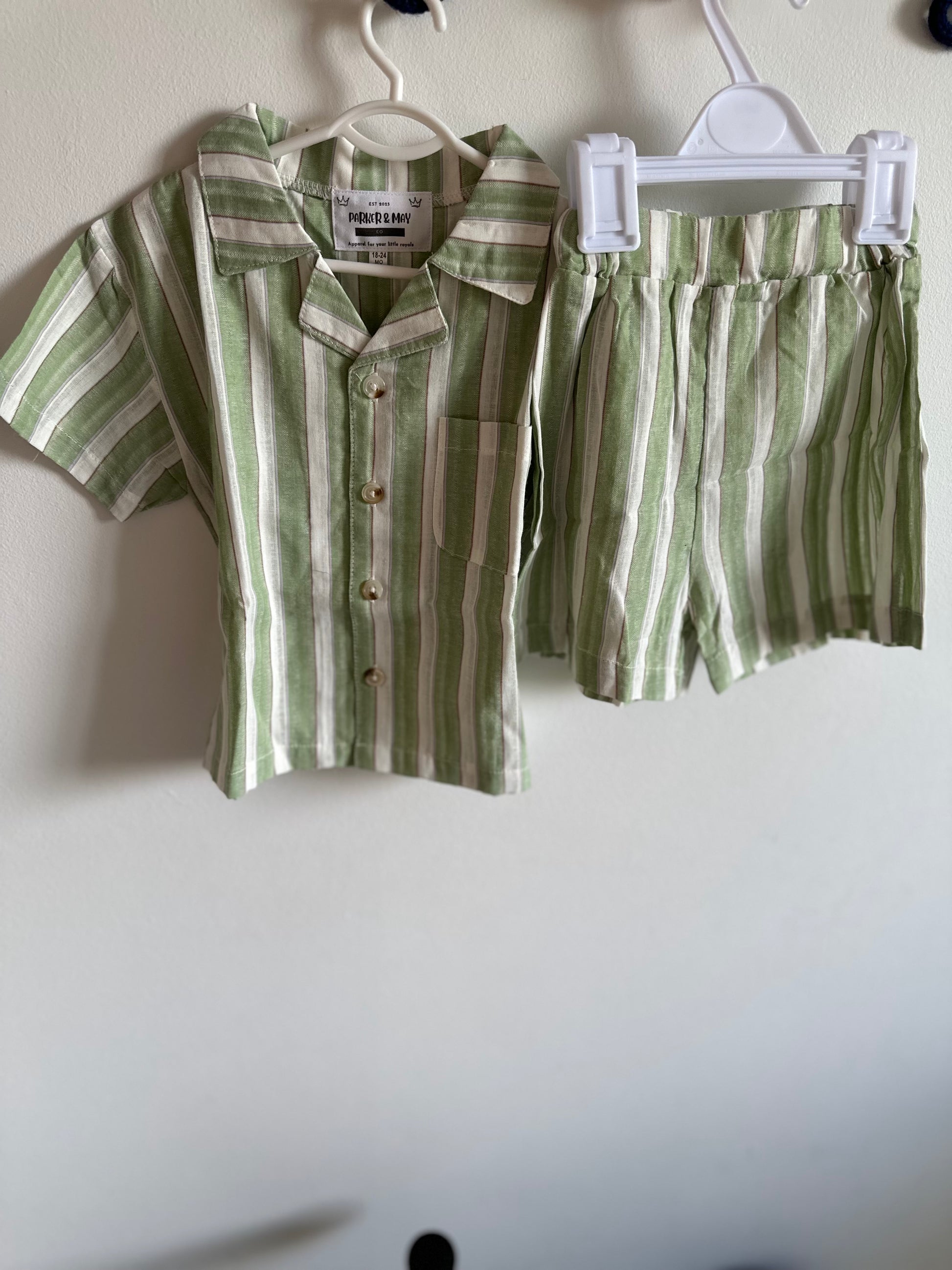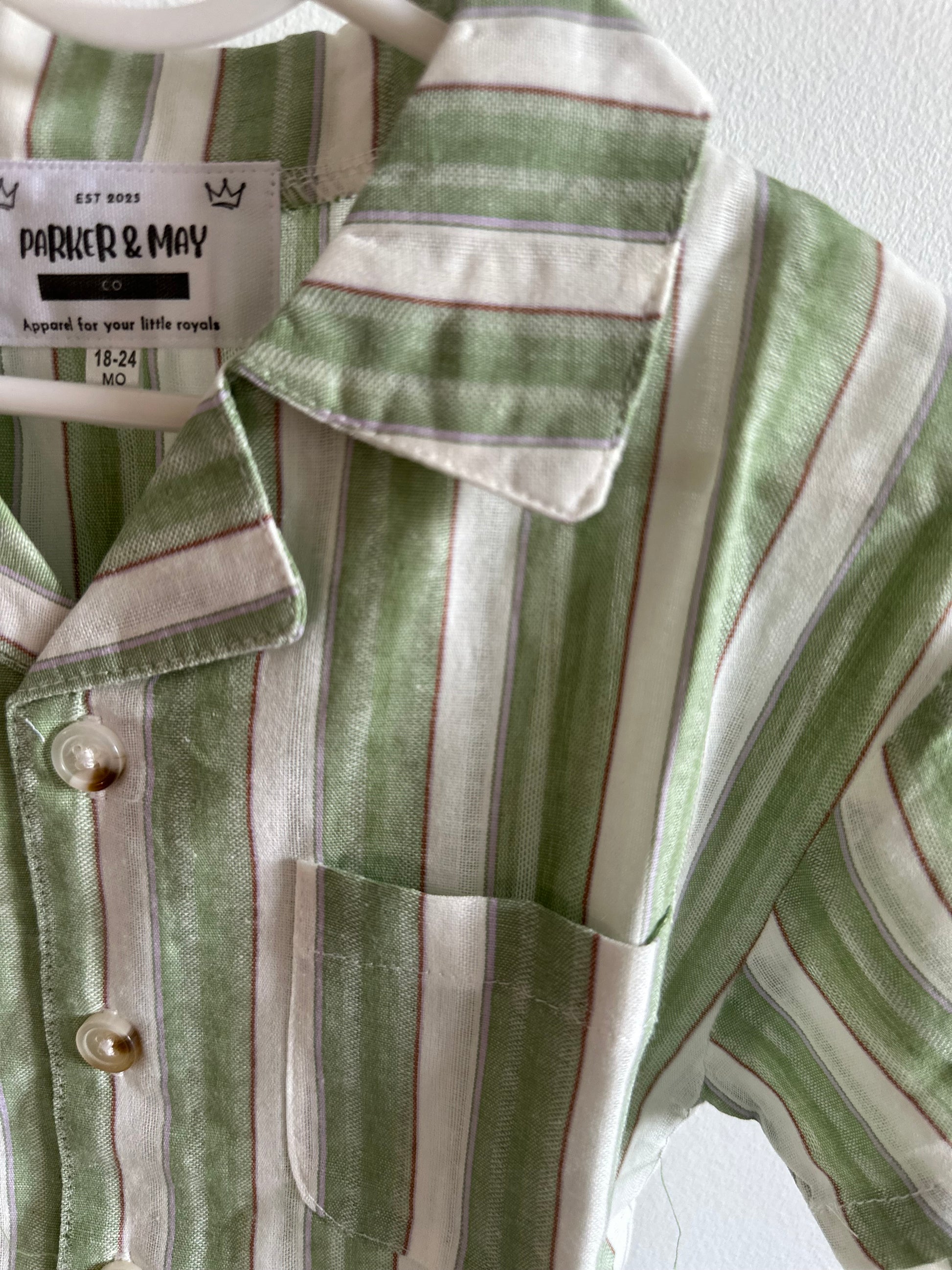 A lightweight and easy breezy set for little ones- this is the Holiday Haven Set! This set comes with a short sleeve button up shirt with a collar and functional pocket. The shorts feature a matching white and green stripe and elastic waist band for easy fitting.