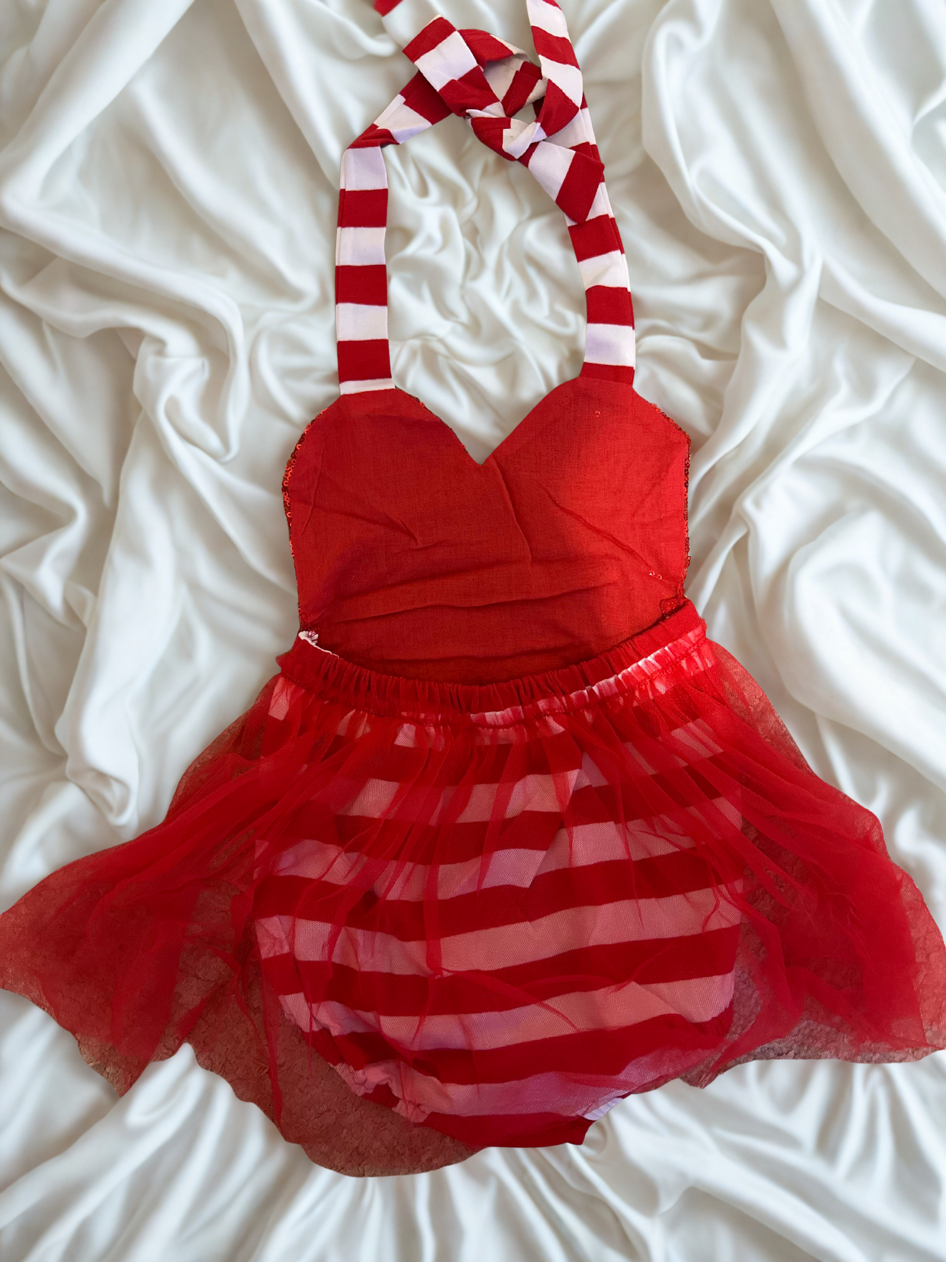 Dress your little one to impress with this glitter filled romper! Our Holly Jolly Romper ties behind the neck, has a glittered bodice with non-functional belt and a super cute skirt coming off the bottom. Buttons to close at the bottom.