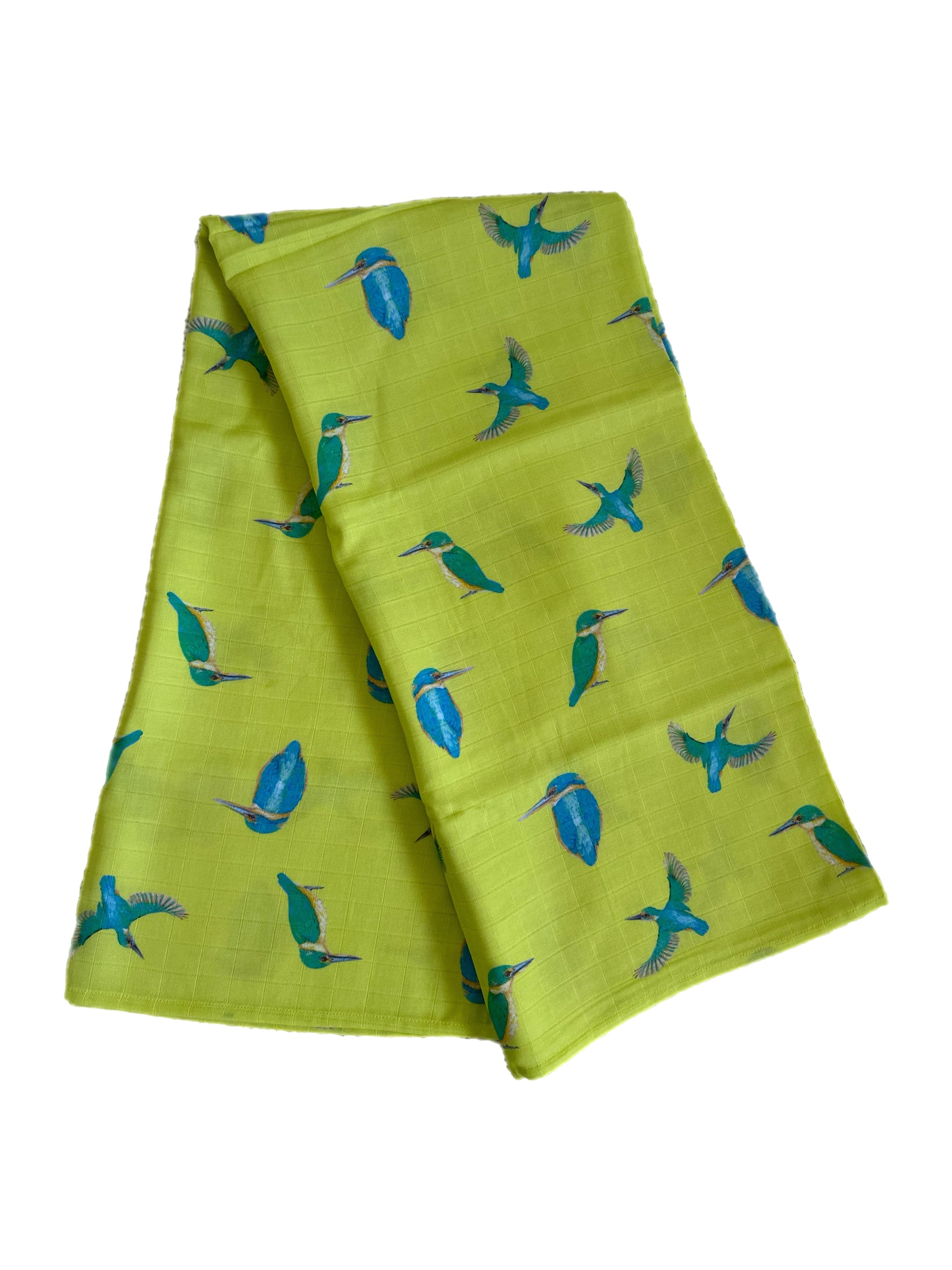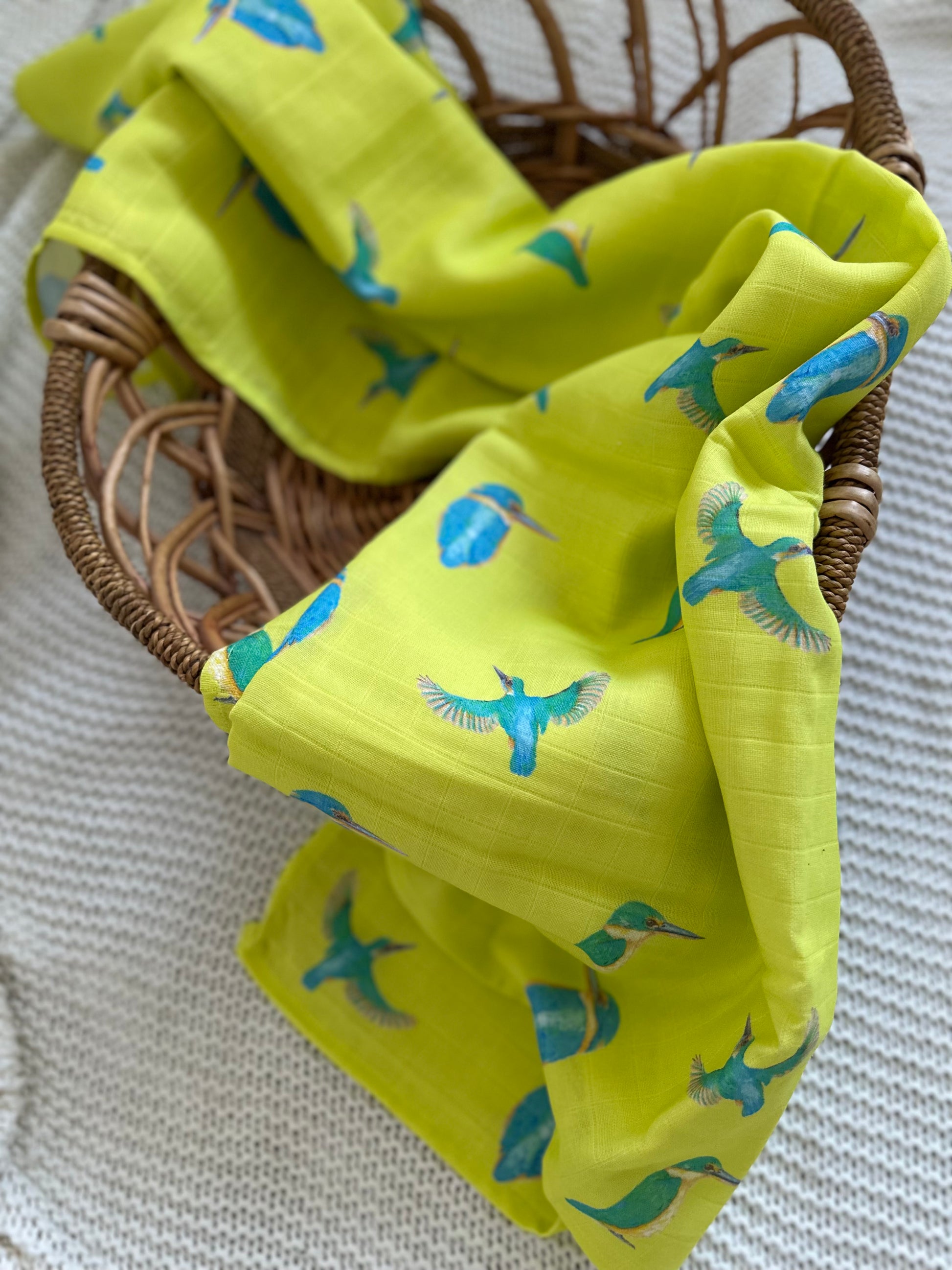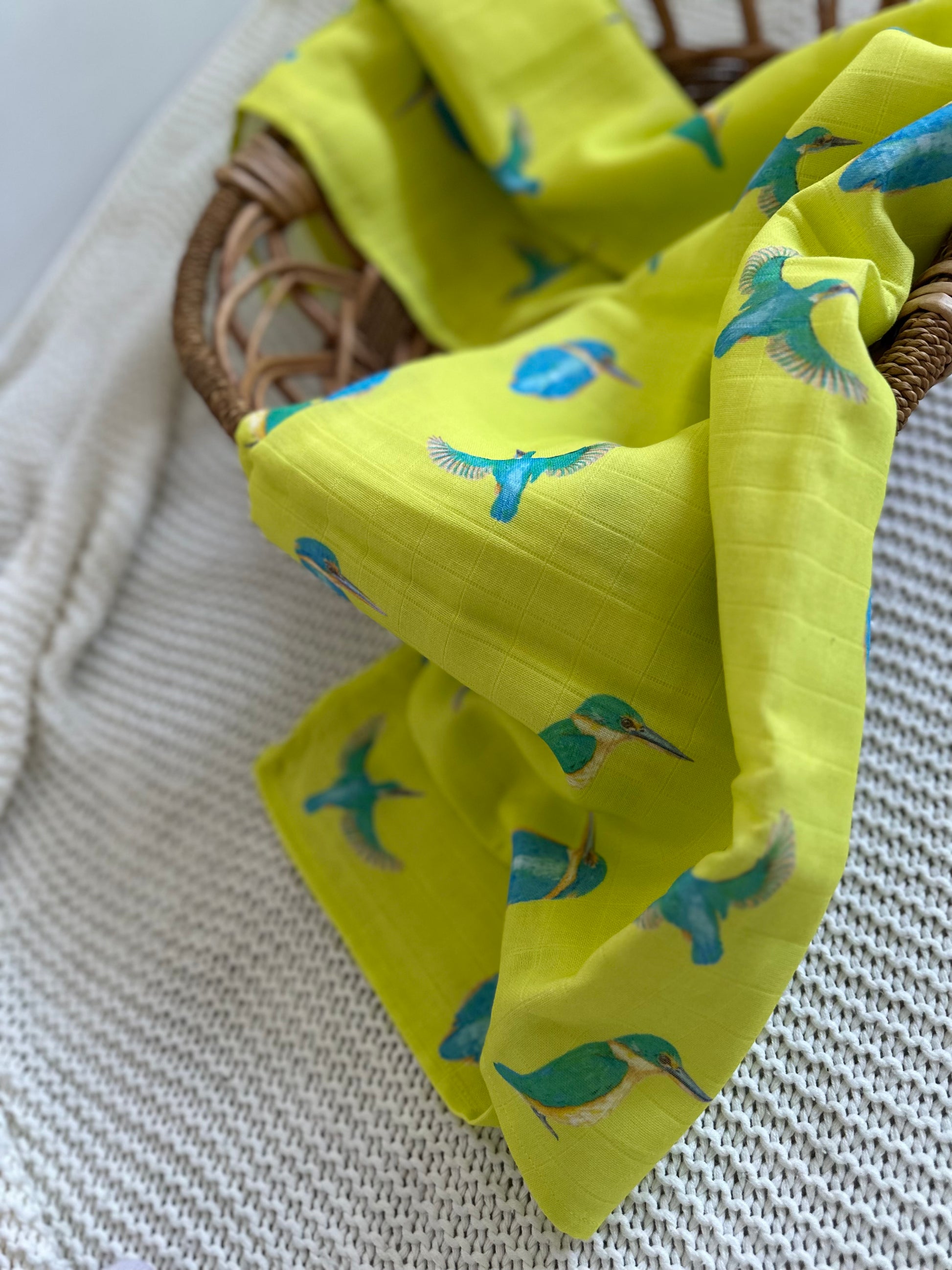 This gorgeous swaddle features Australian Kingfisher’s on a lovely lime-yellow background.