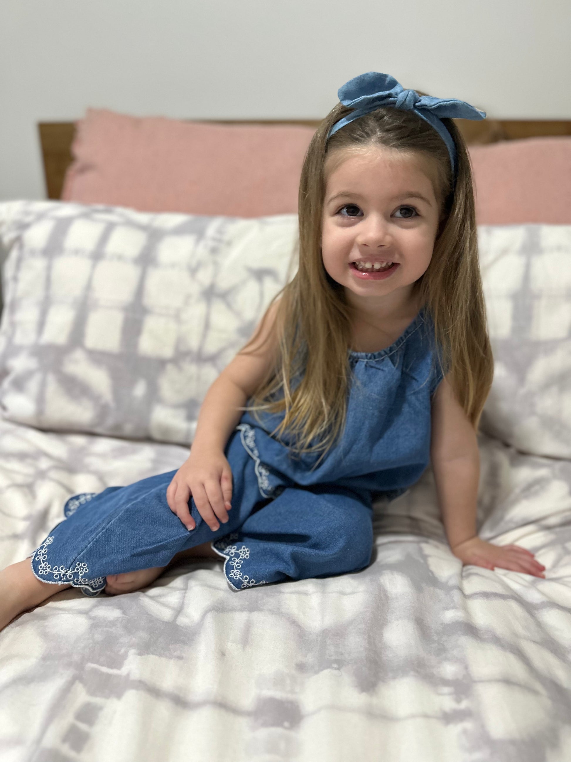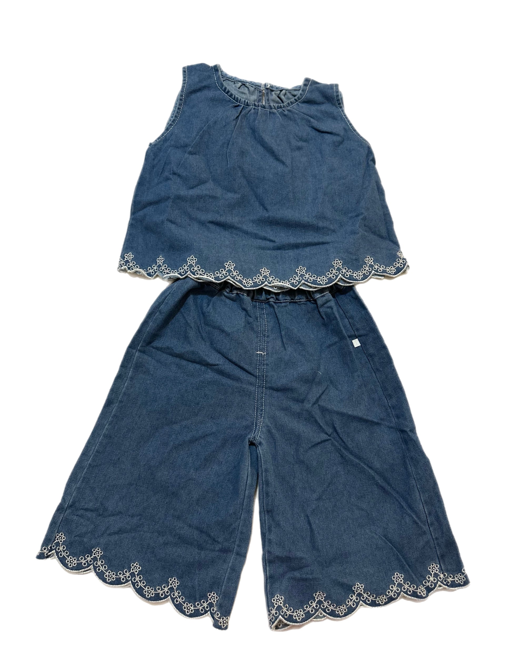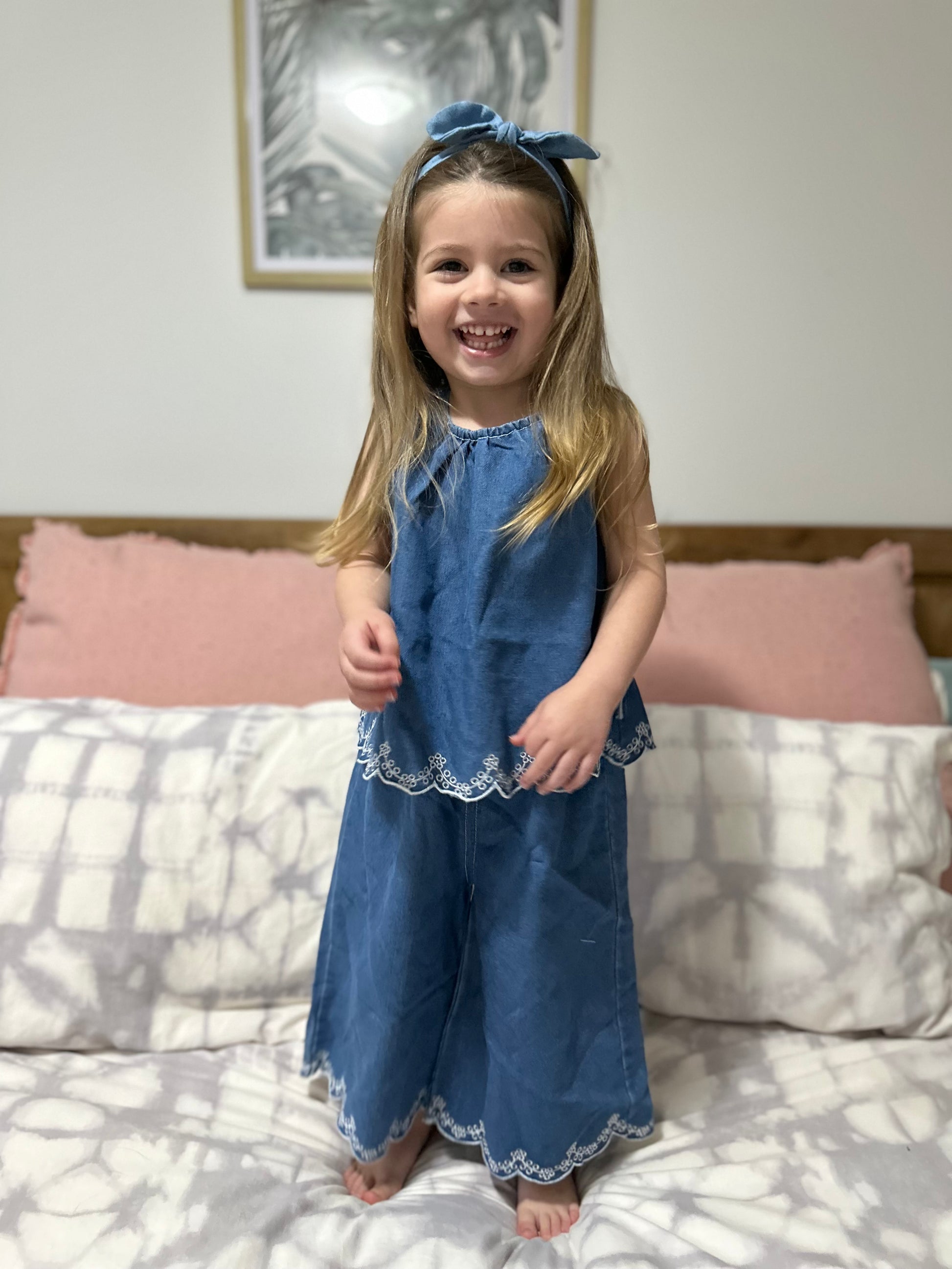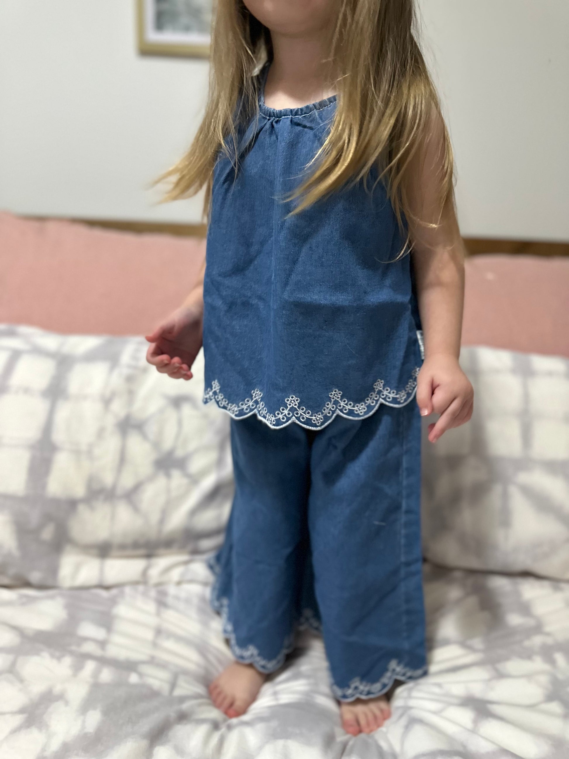 Embroidery- yes please! This sweet Sapphire Dreams Set is the next outfit to make your little one’s wardrobe. Set includes lace embroidered sleeveless top and pants. Both fit loosely. Pants are wide at the base and feature an elastic waist band. The top closes with a button at the back.
