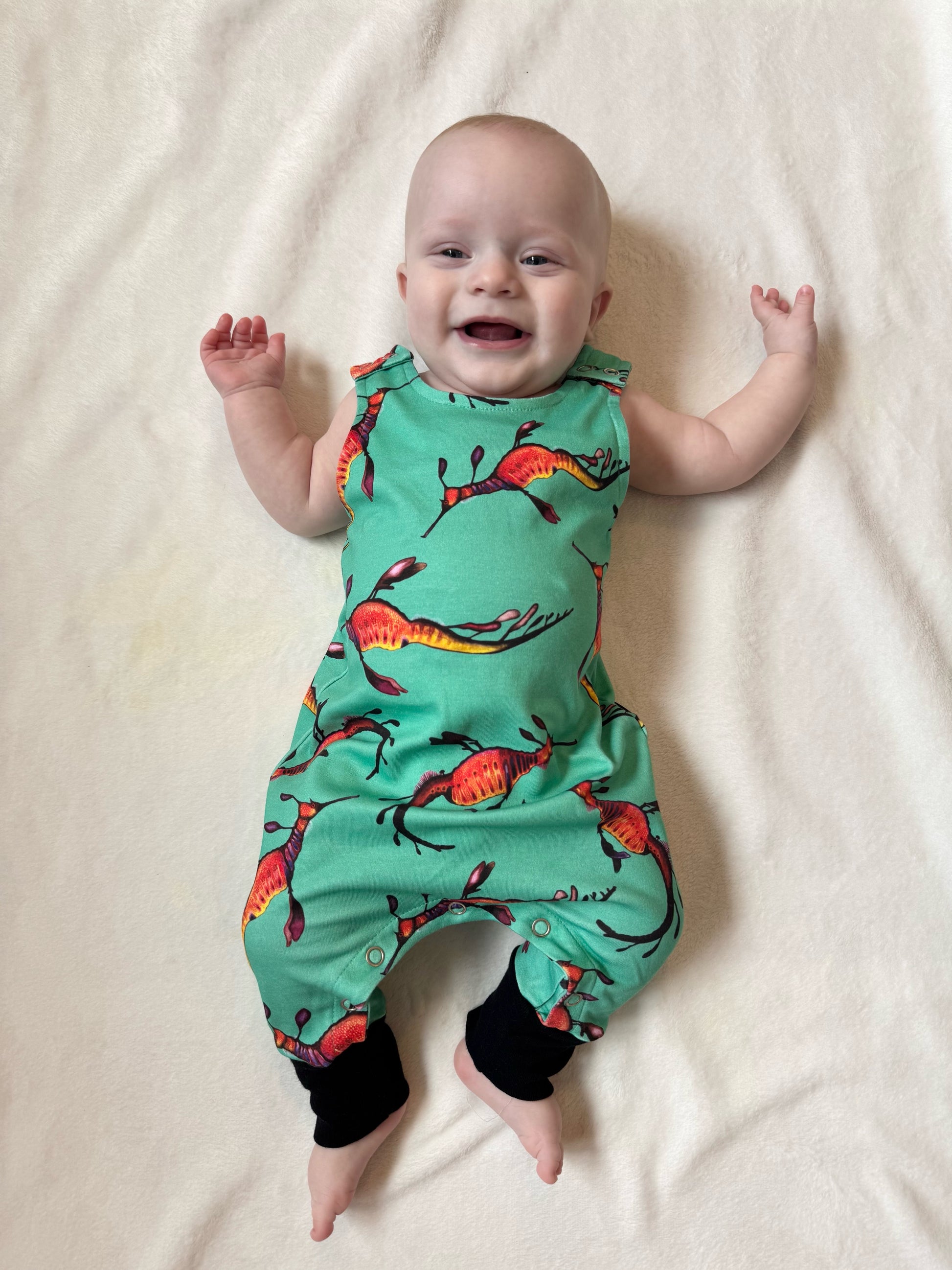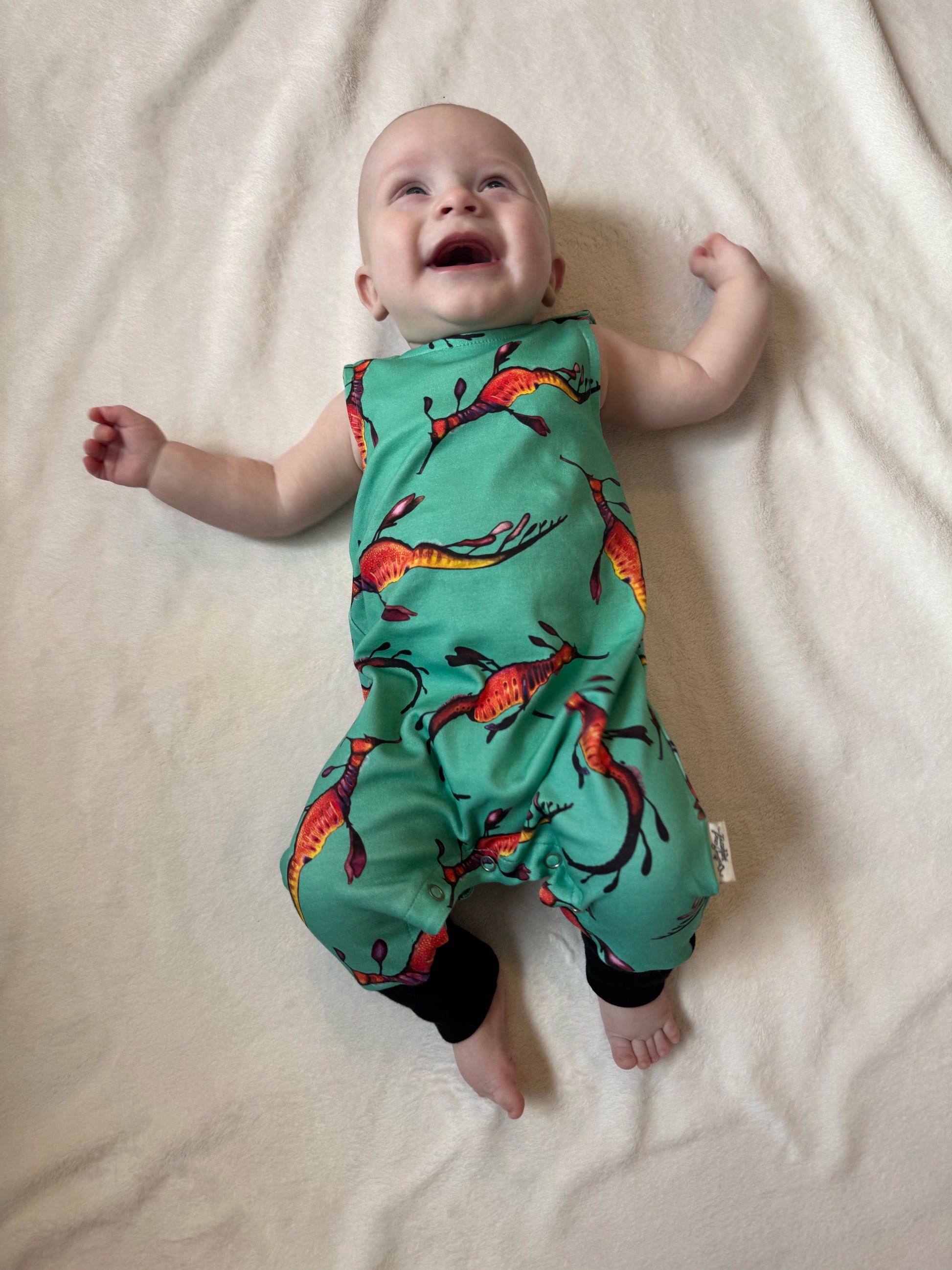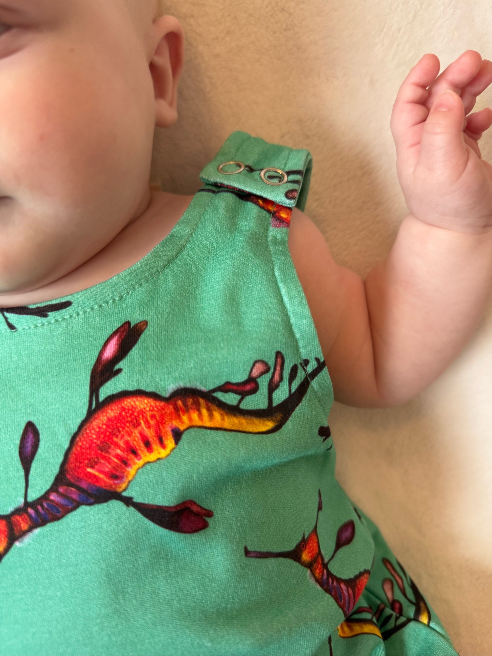 The Weedy Sea Dragon Romper is hand illustrated and has sea dragons on a beautiful aqua background.