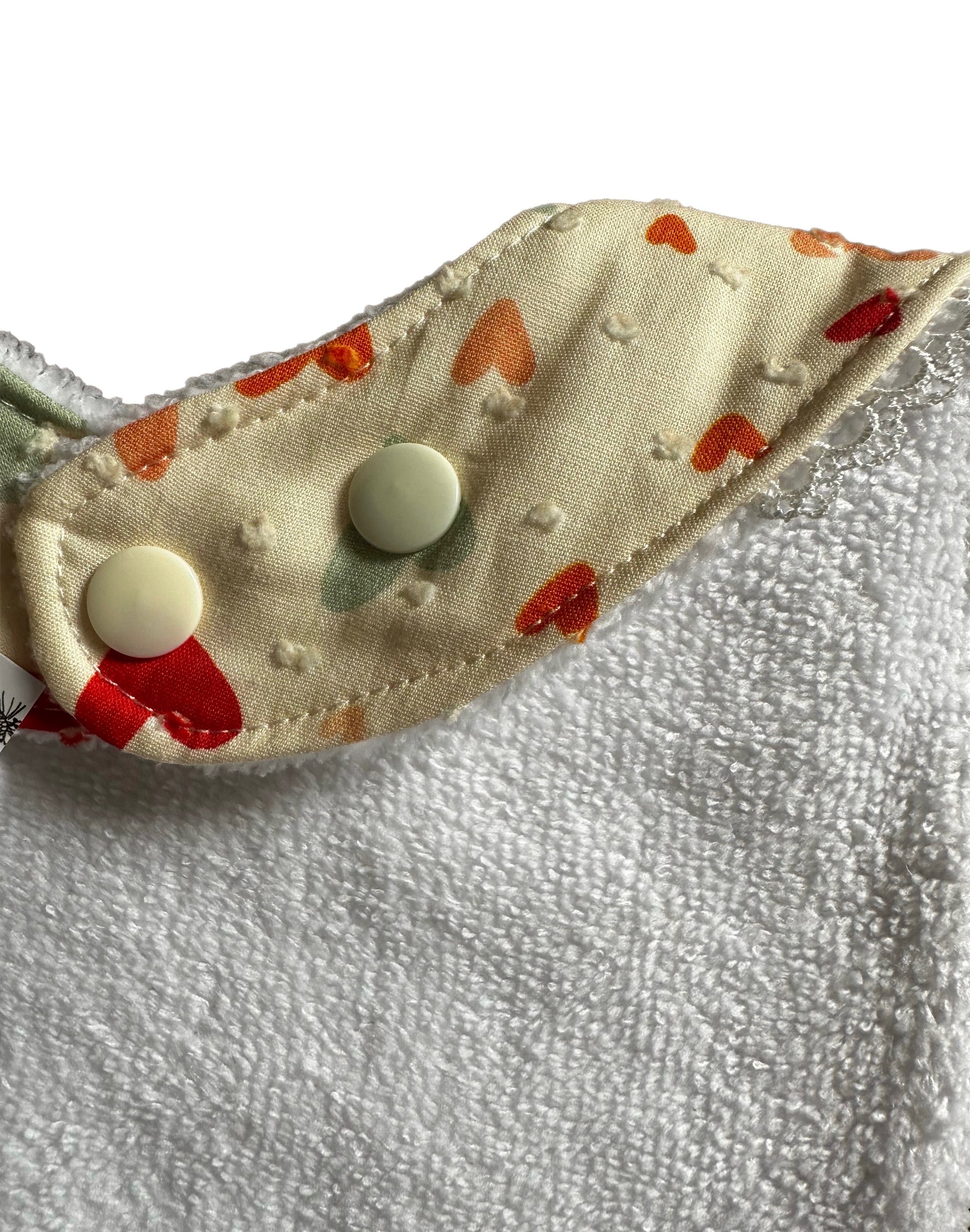 A perfect accessory that your little one needs is the Sofia Baby Bib- Be Mine Set. This bib is both soft and handmade keeping your baby comfortable and dry. This style of bib features a frill detail making it stylish and super cute all at once.