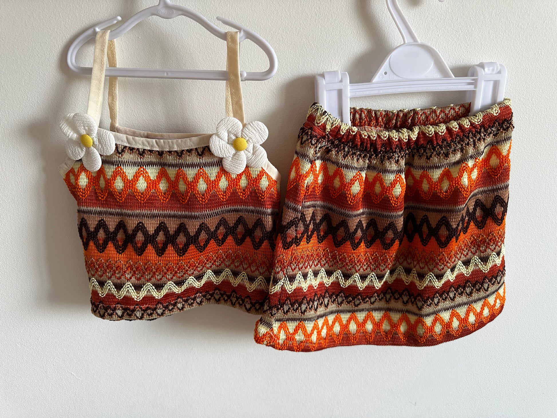 The Summer Sunburst Set is a must have! This set includes a midi, thin strapped top featuring flowers on either strap and an elastic waist band skirt. Skirt finishes above the knee and both are loose fitting.